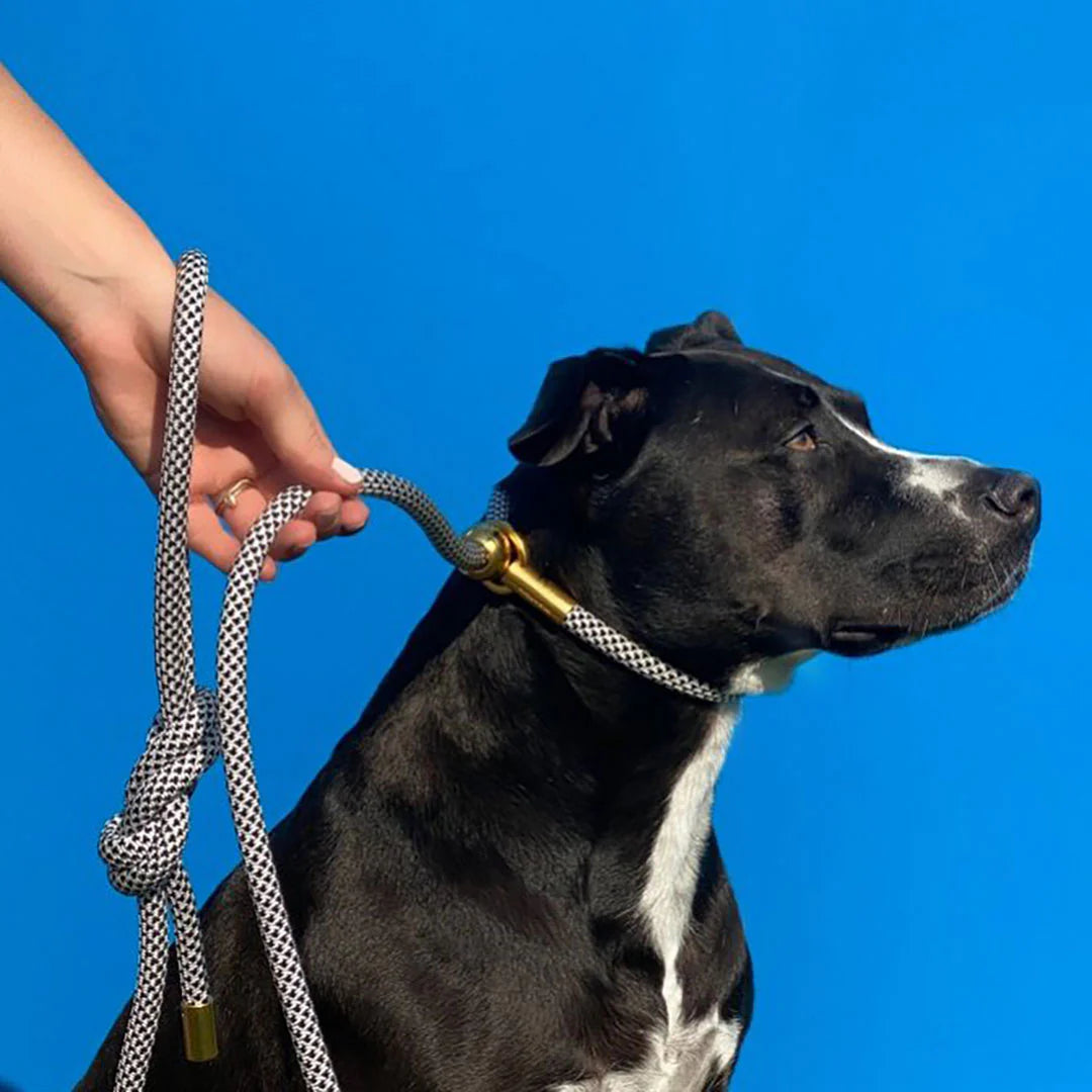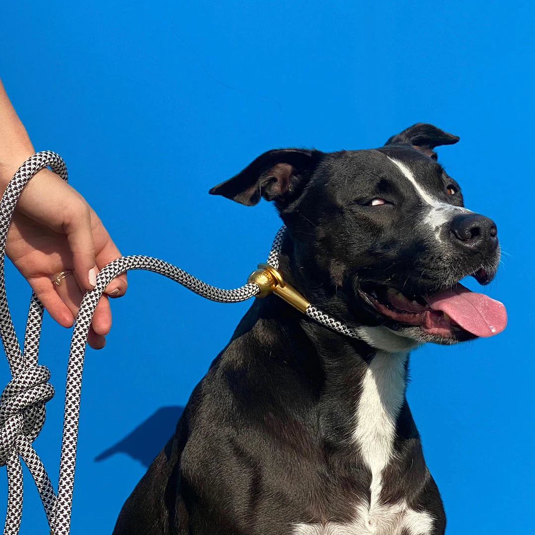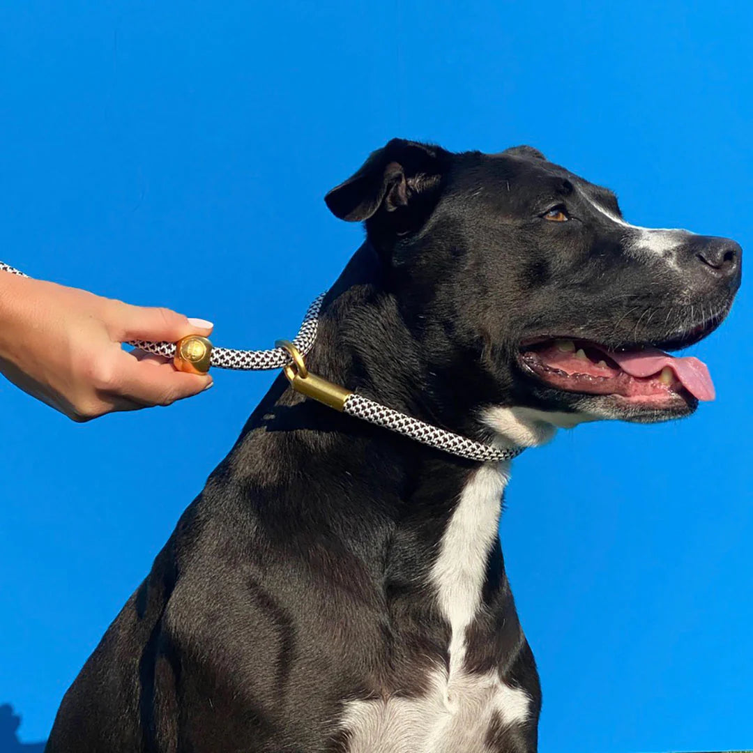 Slide the spring-loaded metal cord lock to tighten the collar section of the rope high on your dog's neck, right under the jawline. When fit properly, the rope will have a smooth transition through the o-ring which will allow you to effectively communicate with your dog and guide them when they need it most.